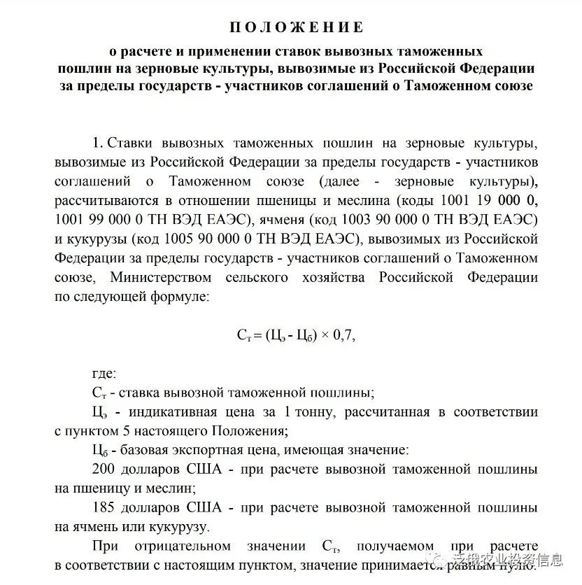 根據(jù)該決議,俄羅斯糧食出口關(guān)稅將基于全球糧食價(jià)格進(jìn)行靈活調(diào)整。小麥出口價(jià)格在低于200美元/噸的情況下,將不會(huì)征收出口關(guān)稅。而出口價(jià)格在高于200美元/噸時(shí),以在交易所備案登記的小麥出口貿(mào)易合同價(jià)格與基準(zhǔn)價(jià)格200美元/噸之間的差額作為基礎(chǔ),按照該差額的70%作為出口關(guān)稅額度。同時(shí),大麥和玉米基準(zhǔn)價(jià)格確定為185美元/噸。