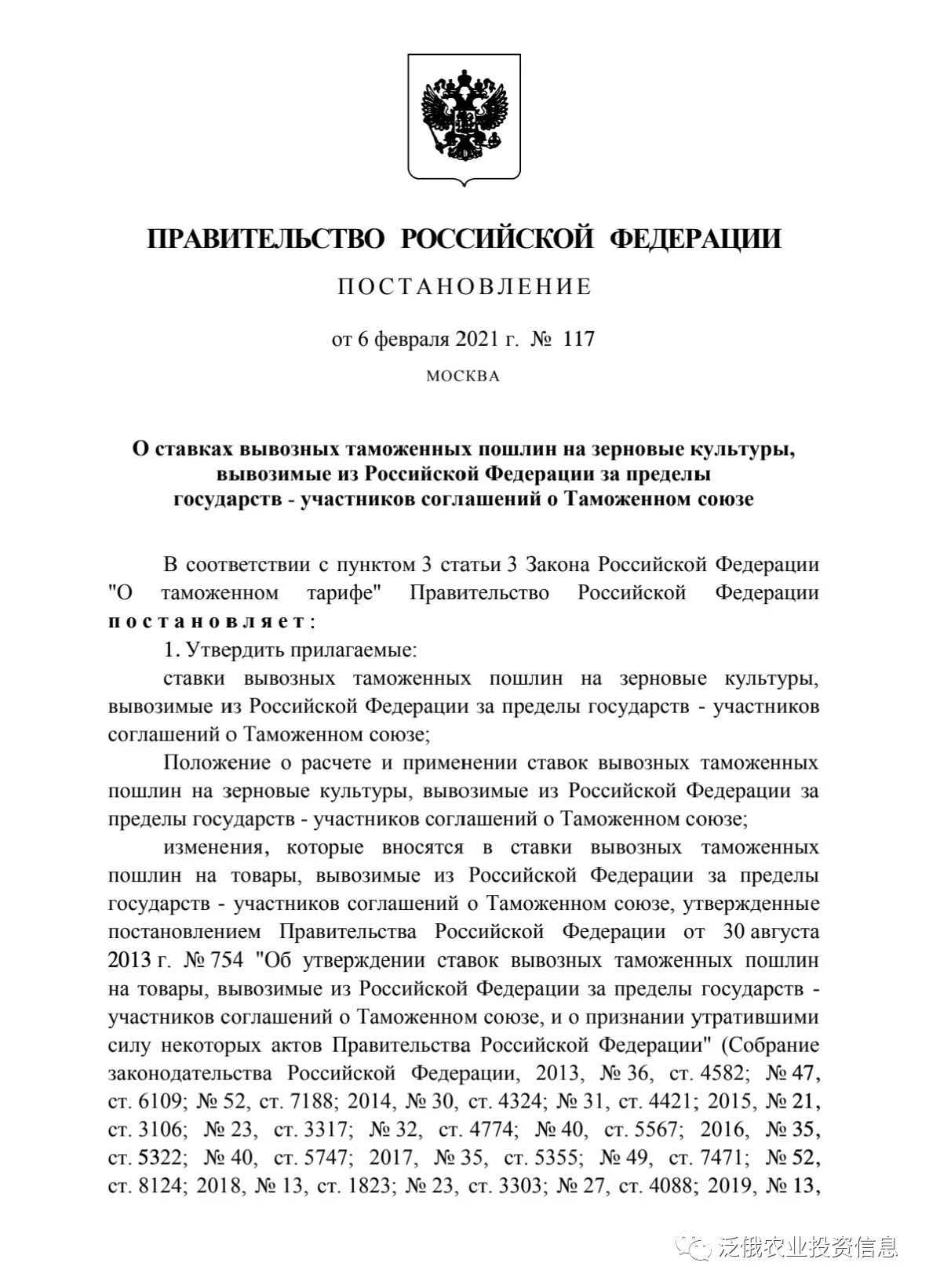 2021年2月6日,俄總理米哈伊爾·米舒斯汀簽署№ 117 號政府令,俄政府決定自6月2日起,對糧食出口實(shí)行彈性關(guān)稅政策。采取彈性出口關(guān)稅是為了預(yù)防全球糧食價(jià)格波動(dòng)對俄羅斯境內(nèi)糧食價(jià)格的影響。